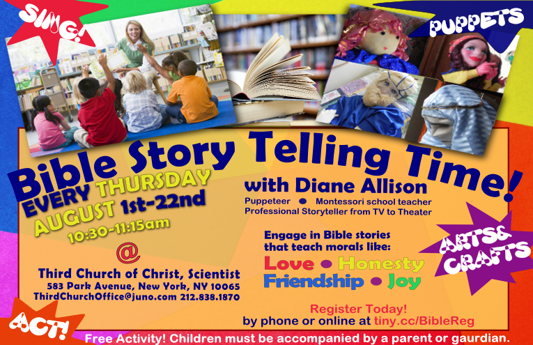 We’ve got three more storytelling times in August, so please come join the fun!  From Thursday, August 8th to August 22nd, 10:30-11:15am, we’ll engage in Bible stories using puppets, arts and crafts, singing, acting, and more!  Storytelling 2 Cropped - 8.1.13